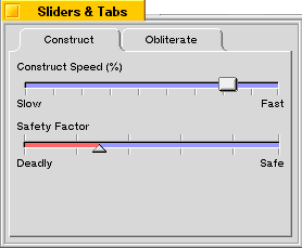 The result is the "Construct Speed (%)" slider in the window pictures below. An example of a slider with the B_TRIANGLE_THUMB thumbType and hash marks above and below the slider is also shown.