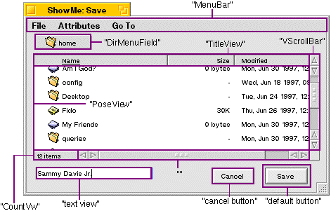 BFilePanel knows how to create and display an "Open File" or "Save File" panel, and provides the means for filtering and responding to the user's actions on the panel. The Save Panel looks like this: